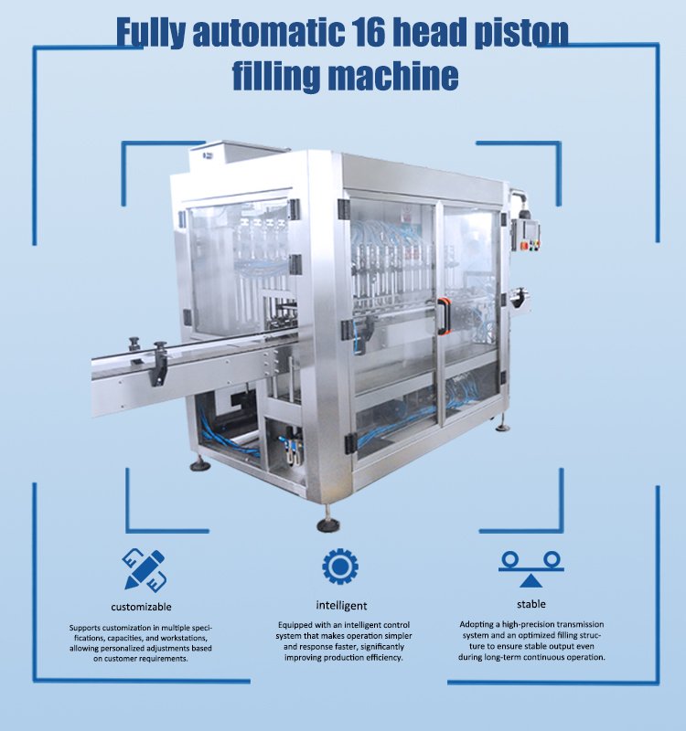 The Fully Automatic 16-Head Piston Filling Machine is designed for high-speed, high-precision filling of liquid and semi-viscous products. Equipped with 16 simultaneous piston filling heads, this machine offers large production capacity, stable operation, and excellent accuracy, making it ideal for medium to large-scale production lines.
