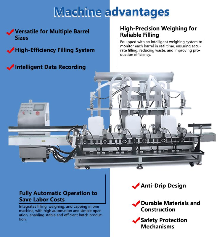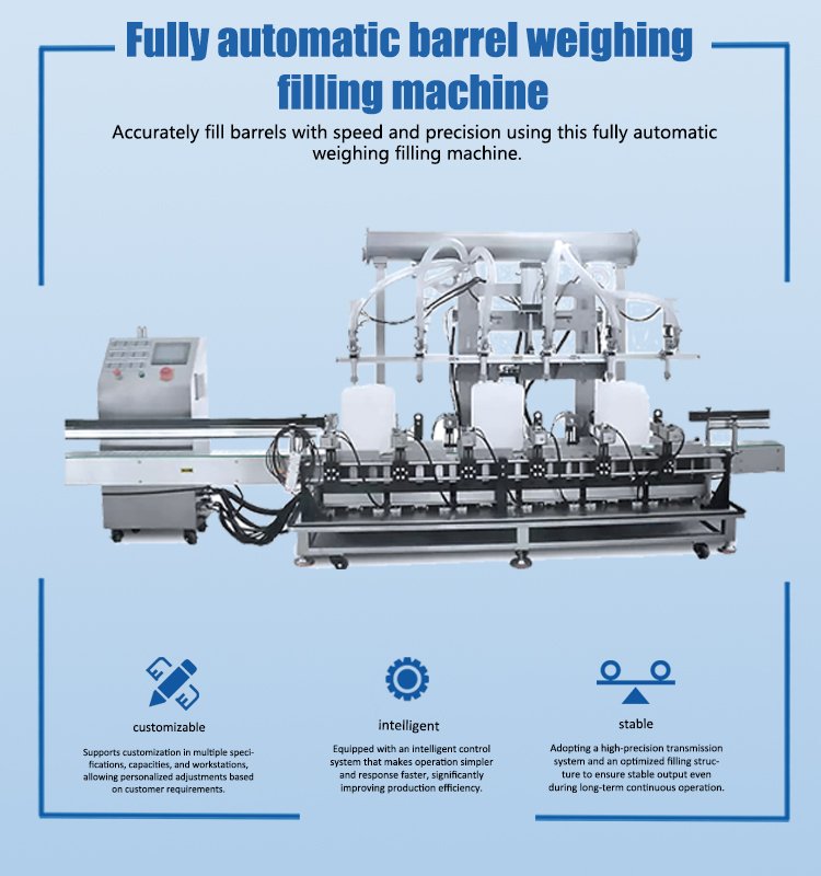 The Fully Automatic Barrel Weighing and Filling Machine is a high-efficiency device specially designed for large-capacity liquids, pastes, or granular materials. It is widely used in food, chemical, pharmaceutical, and daily chemical industries.