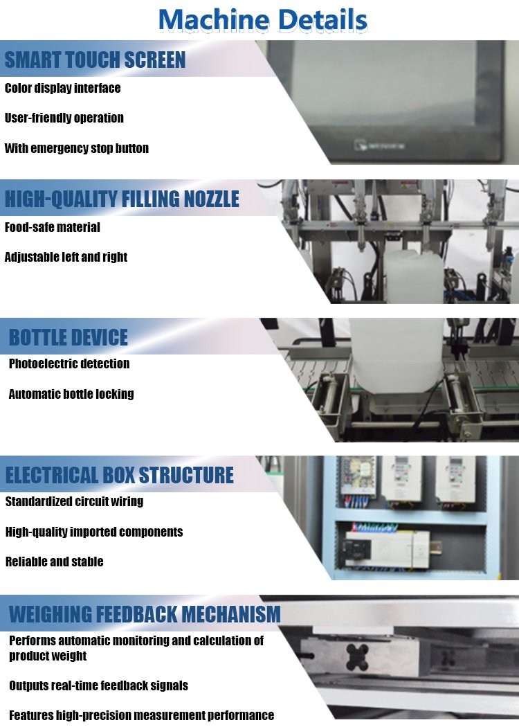 PLC or touch screen interface for user-friendly operation, real-time display of filling weight, speed, and error alarms.