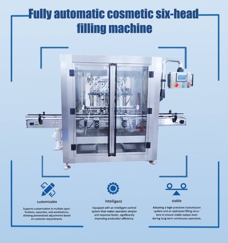 This fully automatic six-head cosmetic filling machine is specially designed for lotions, creams, serums, and other cosmetic products. Featuring an advanced automatic control system, it delivers high-speed, high-precision filling. The machine is easy to operate, adaptable to various bottle types, and significantly improves production efficiency while ensuring consistent product quality.