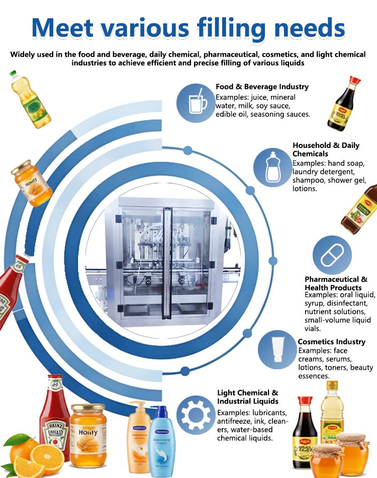 Six filling heads work simultaneously for high efficiency, ideal for large-scale production.