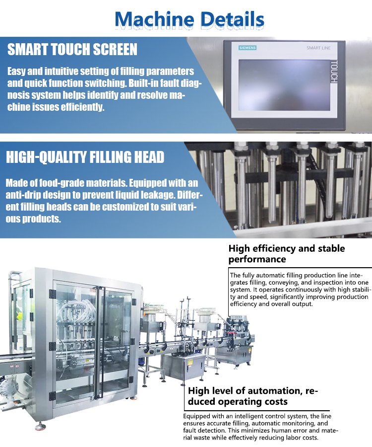 Filling heads feature anti-drip devices to prevent spills or contamination, keeping the production area clean.