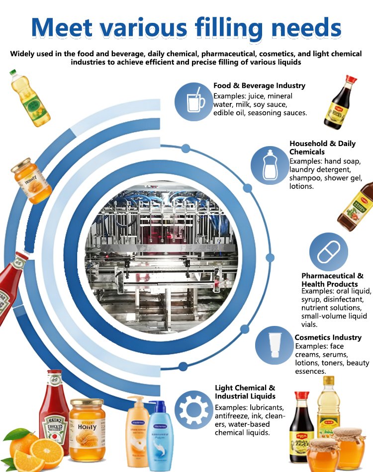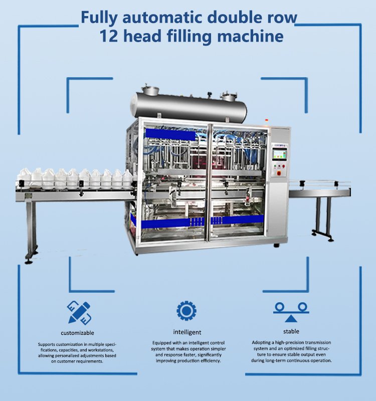 This fully automatic double row 12-head filling machine is widely used for filling various liquid and semi-liquid products, including:
