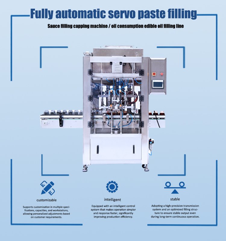 The machine adopts a servo-driven piston filling system (or optional servo screw filling system), ensuring precise and stable filling performance.