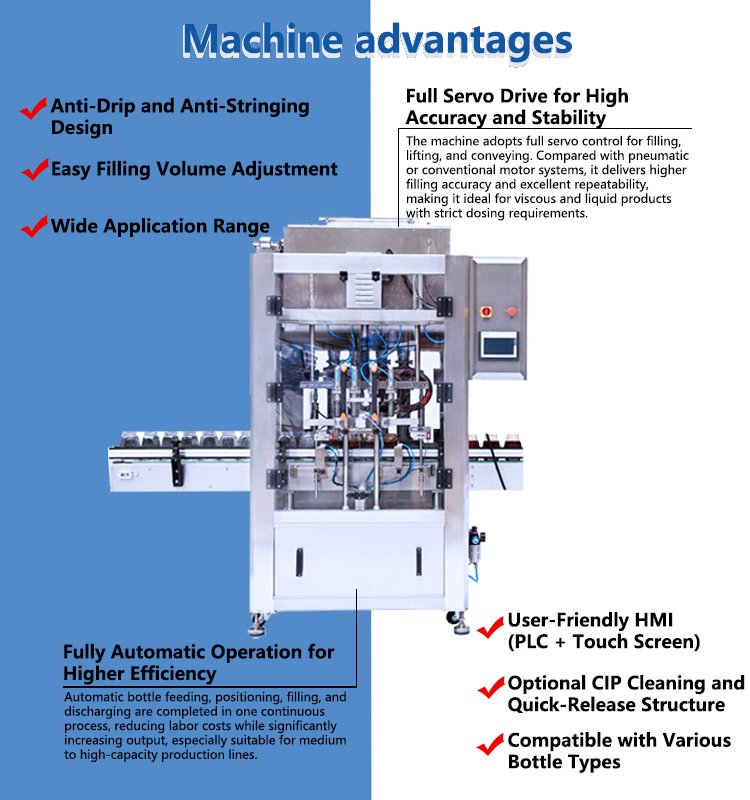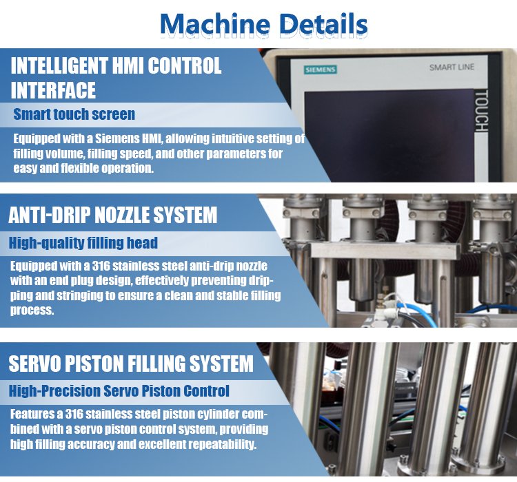 - High Filling Precision: Servo control ensures consistent filling volume for every bottle, reducing product waste.