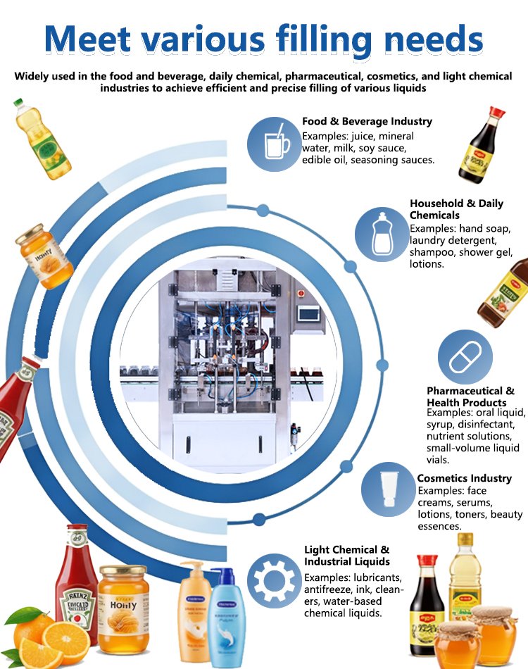 - High Production Efficiency: Multi-head simultaneous filling meets medium to high output demands.