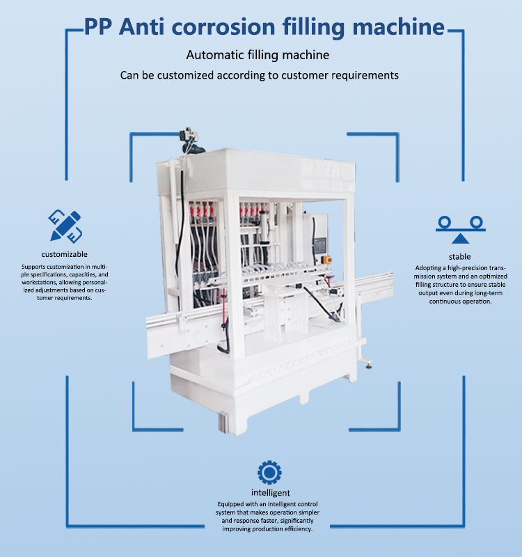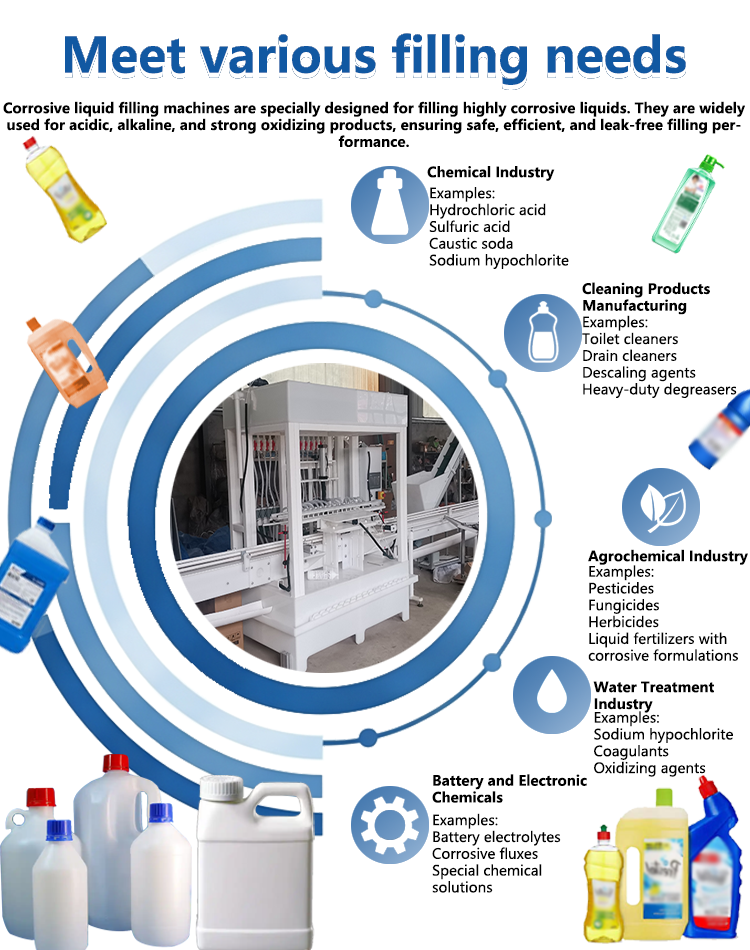 This equipment is widely used in the daily chemical, chemical, agrochemical, and cleaning product industries. It delivers stable and precise filling performance and serves as the key equipment in a corrosive-liquid filling production line.
