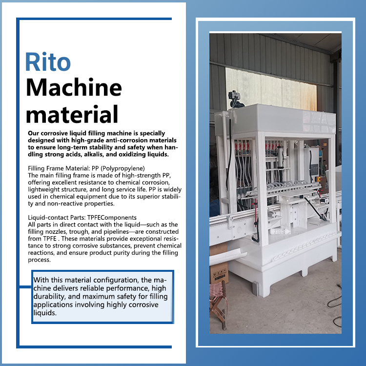 The corrosive liquid filling machine is specially designed for acidic, alkaline, and strongly oxidizing liquids, such as sodium hypochlorite, disinfectants, cleaning agents, acid–alkali solutions, and chemical additives. The entire machine is built with high-grade anti-corrosion materials, including PP, TPFE, and UPVC, which effectively resist chemical corrosion and ensure long-term stable operation. All liquid-contact parts are made of corrosion-resistant materials to prevent metal rust and contamination, ensuring product quality and safety from the source.