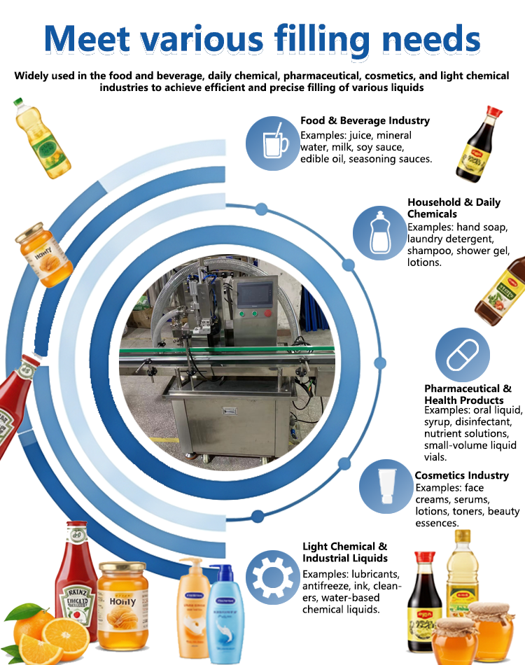 1.Suitable for filling a wide range of liquids, including low- and medium-viscosity products, and widely used in food, chemical, pharmaceutical, cosmetic, and related industries.