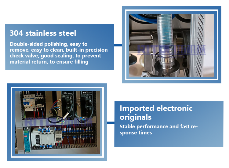 The single head liquid filling machine from Rito is equipped with one filling nozzle and achieves a filling speed of up to 30–40 bottles per minute. The machine adopts a servo-controlled butterfly valve system to drive the piston cylinder, ensuring stable operation and precise volume control.