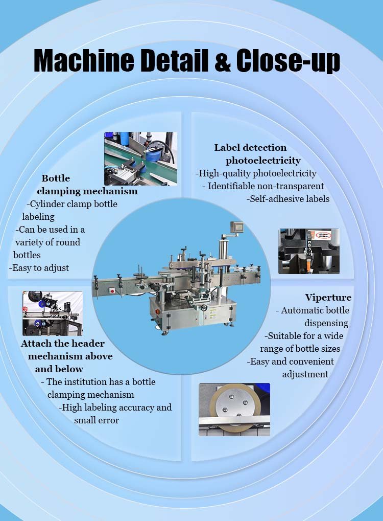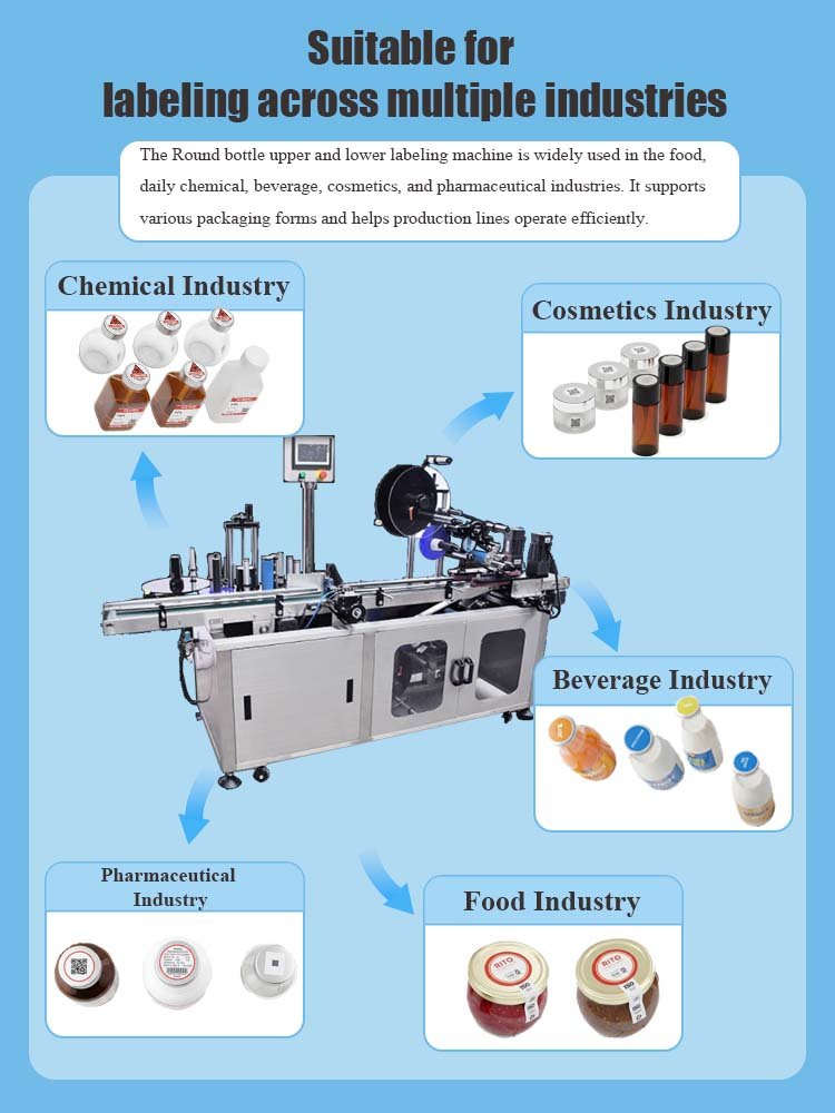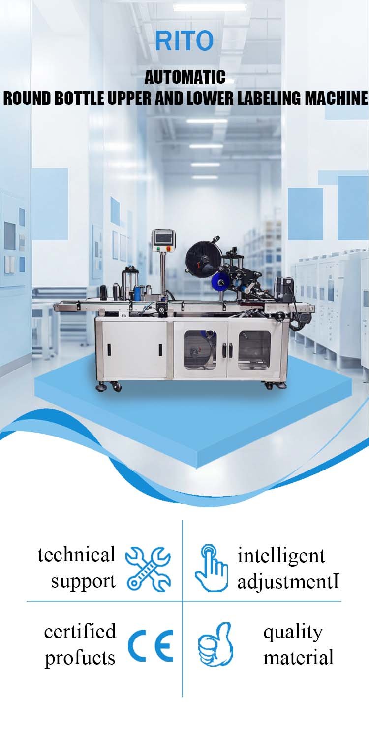 Automatic Round Bottle Upper & Lower Labeling Machine | RITO Packaging Product showcase Product Application Product details Company introduction More product