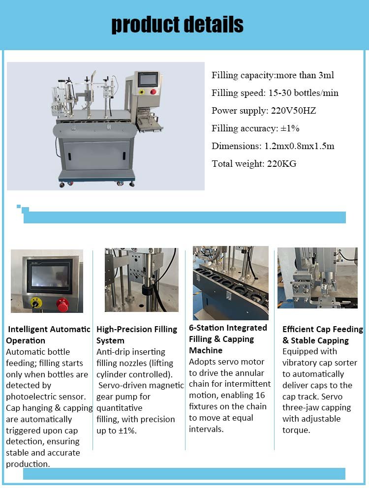 Automatic Bottle Feeding Filling and Capping Machine for Liquid Products in Food Cosmetic and Pharmaceutical Industry Product showcase Suitable For Product Details Company Introduction